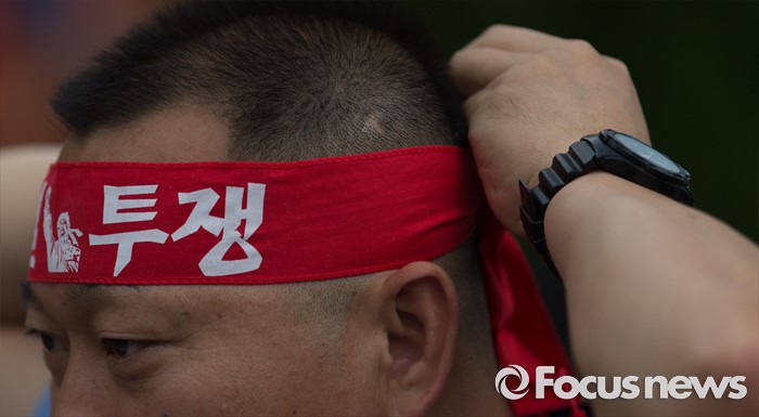 | △ '투쟁' 머리끈 묶는 조합원 |