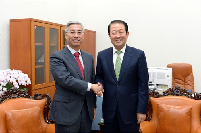 (서울=포커스뉴스) 국민의당 소속 박주선(오른쪽) 국회 부의장이 24일 서울 여의도 국회를 방문한 추궈홍 주한중국대사와 면담에 앞서 악수를 하고 있다. <사진제공=박주선 의원실>