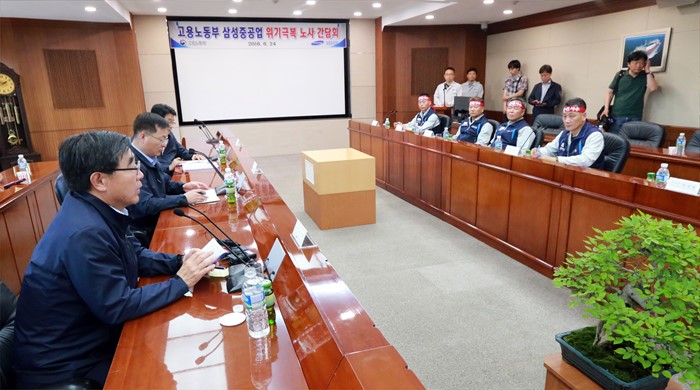 (거제=포커스뉴스) 이기권 고용노동부 장관이 24일 경남 거제 삼성중공업 노사와 간담회를 갖고 업황 부진으로 어려움을 겪는 조선업 종사자 의견을 청취하고 있다. <사진제공=고용노동부>