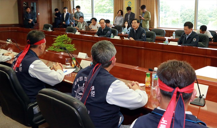 (거제=포커스뉴스) 이기권 고용노동부 장관이 24일 경남 거제 삼성중공업 노사와 간담회를 갖고 업황 부진으로 어려움을 겪는 조선업 종사자 의견을 청취하고 있다. <사진제공=고용노동부>
