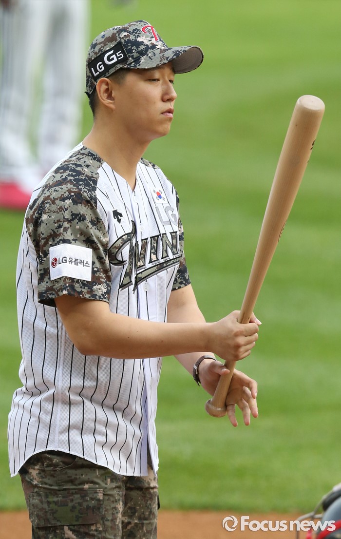 (서울=포커스뉴스) 24일 서울 잠실구장에서 열린 2016 프로야구 넥센-LG 경기에 앞서 6.25전쟁 발발 66주년을 맞아 '땡큐 솔저스' 행사를 갖고 북한의 지뢰 도발로 부상당한 김정원 하사가 시타 준비하고 있다.