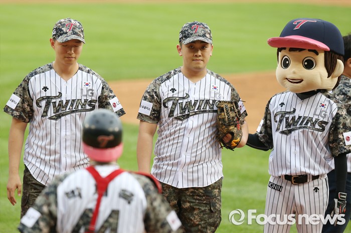 (서울=포커스뉴스) 24일 서울 잠실구장에서 열린 2016 프로야구 넥센-LG 경기에 앞서 6.25전쟁 발발 66주년을 맞아 '땡큐 솔저스' 행사를 갖고 북한의 지뢰 도발로 부상당한 하재헌 하사(가운데)와 김정원 하사가 시구,시타를 마치고 LG 포수 박재욱과 악수하고 있다.
