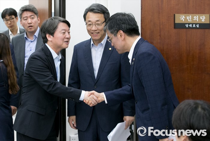 김 정책위의장은 이날 회의에서 최상목 기획재정부 1차관에게 현안 보고를 들은 뒤 "정부가 나름대로 기민하게 대처하고 있다"며 "시장 변동성이 크게 생긴다 하더라도 나름대로 준비하고 있다는 인상을 받았다"고 밝혔다.(서울=포커스뉴스) 안철수(왼쪽) 국민의당 상임공동대표가 24일 오후 서울 여의도 국회에서 열린 브렉시트(Brexit) 대책회의에 앞서 최상목 기획재정부 1차관과 인사하고 있다. 가운데는 김성식 정책위의장. 2016.06.24 박동욱 기자