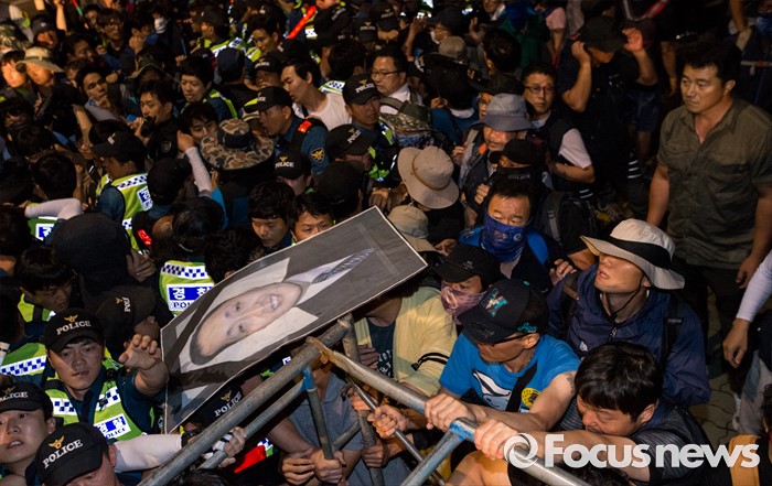 (서울=포커스뉴스) 24일 오후 서울 서초구 현대자동차 본사 앞에서 열린 '유성기업 故 한광호씨 100일ㆍ현대차 진격의 날' 집회에 참석한 노동자들과 경찰이 충돌을 빚고 있다.