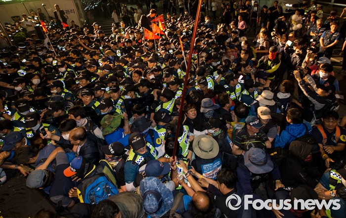(서울=포커스뉴스) 24일 오후 서울 서초구 현대자동차 본사 앞에서 열린 '유성기업 故 한광호씨 100일ㆍ현대차 진격의 날' 집회에 참석한 노동자들과 경찰이 충돌을 빚고 있다.