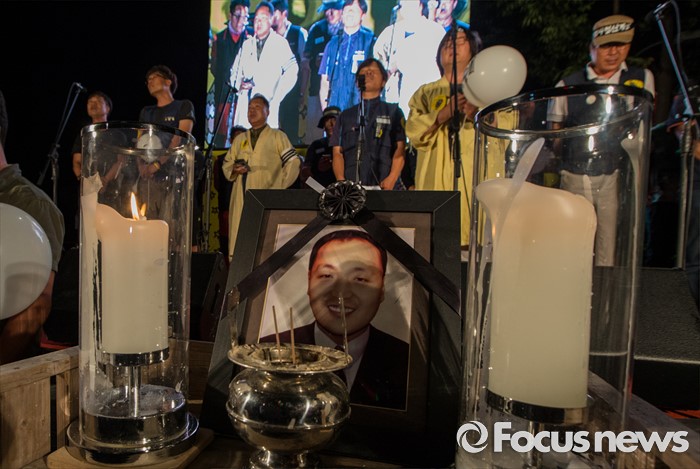 (서울=포커스뉴스) 24일 오후 서울 서초구 현대자동차 본사 앞에서 열린 '유성기업 故 한광호씨 100일ㆍ현대차 진격의 날' 집회에 고인의 영정이 놓여 있다.