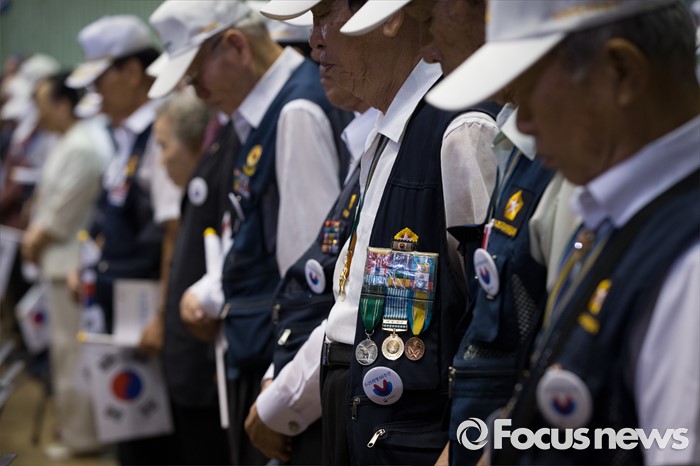 (서울=포커스뉴스) 25일 오전 서울 송파구 잠실실내체육관에서 열린 '6.25전쟁 66주년 기념식'에 참석한 참전용사 및 시민들이 국민의례를 하고 있다.