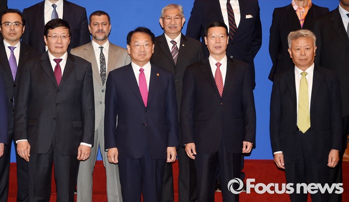 (서울=포커스뉴스) 유일호 부총리 겸 기획재정부 장관이 25일 중국 북경 월드호텔에서 열린 '제1차 아시아인프라개발은행(AIIB) 연차총회' 참석,각국 대표들과 기념촬영에 앞서 환담을 나누고 있다.왼쪽부터 러우 지웨이 중국 재무장관, 유일호 부총리, 장가오리 중국 상무위원, 진리 췬 AIIB 총재. <사진제공=기획재정부>