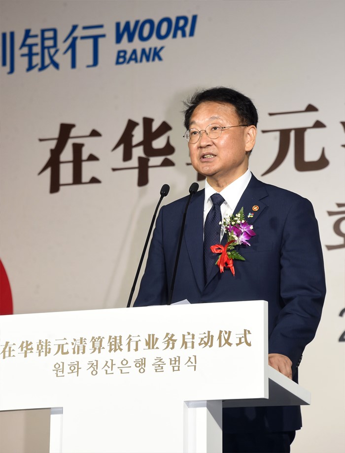 (서울=포커스뉴스) 제1차 아시아인프라개발은행(AIIB) 연차총회 참석차 중국 북경을 방문중인 유일호 부총리 겸 기획재정부 장관이 24일 웨스틴호텔에서 열린 '원-위안화 직거래 관련 청산은행 개소식'에 참석해축사를 하고 있다. <사진제공=기획재정부>