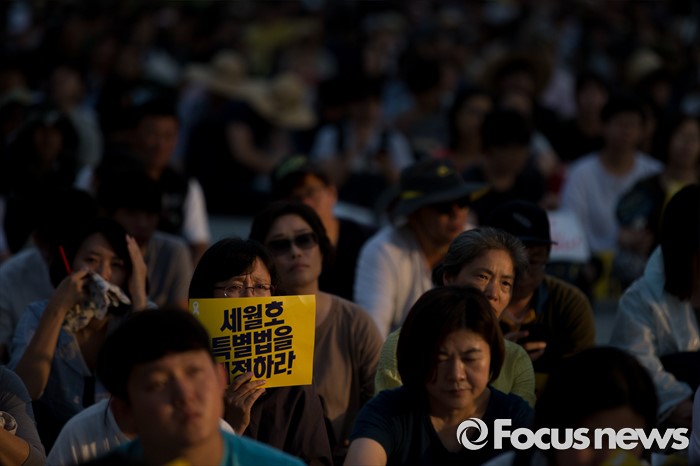 (서울=포커스뉴스) 25일 오후 서울 종로구 광화문광장에서 세월호 가족협의회 및 시민들이 참석한 가운데 '세월호 특별법 개정 촉구 범국민대회'가 열리고 있다.