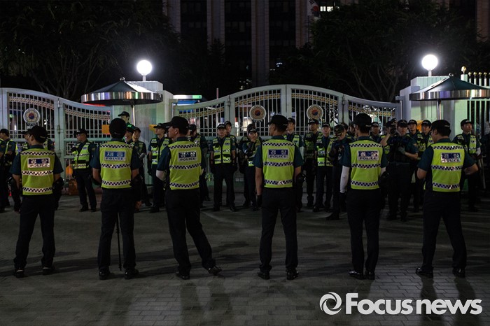 (서울=포커스뉴스) 25일 오후 서울 종로구 서울정부청사 앞에서 세월호 가족협의회 및 시민들이 세월호 특별법 개정과 온전한 인양을 촉구하며 농성을 벌이는 중 경찰병력은 청사문을 방호하고 있다.