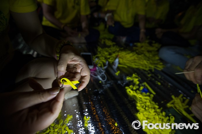 (서울=포커스뉴스) 25일 오후 서울 종로구 서울정부청사 앞에서 세월호 가족협의회 및 시민들이 세월호 특별법 개정과 온전한 인양을 촉구하며 농성을 벌이며 노란 리본 고리를 만들고 있다.