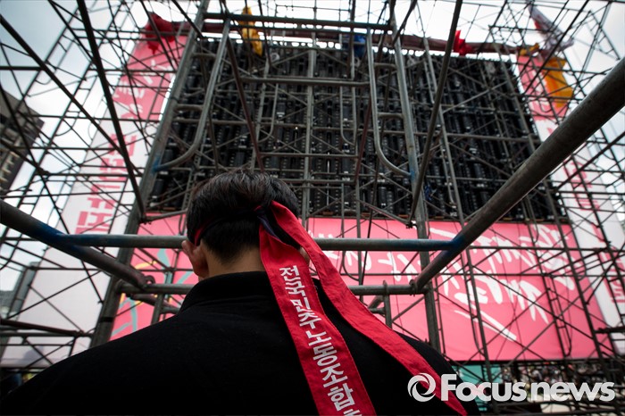 (서울=포커스뉴스) 25일 오후 서울 중구 시청광장에서 열린 '민주노총 전국노동자대회' 참석자들이 최저임금 1만원, 비정규직 철폐를 촉구하고 있다.