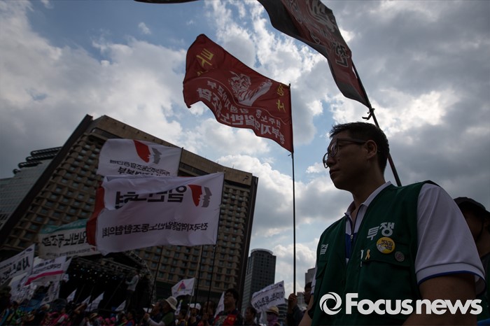 (서울=포커스뉴스) 25일 오후 서울 중구 시청광장에서 열린 '민주노총 전국노동자대회' 참석자들이 최저임금 1만원, 비정규직 철폐를 촉구하고 있다.