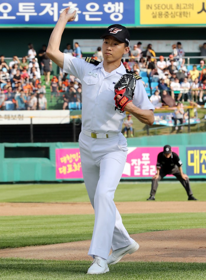 (대전=포커스뉴스) 25일 오후 대전 한화생명이글스파크에서 열린 2016 타이어뱅크 KBO리그 한화 이글스와 롯데 자이언츠의 경기에 앞서 천안함 참전자 정다운 대위가 시구를 하고 있다. <사진제공=한화이글스>