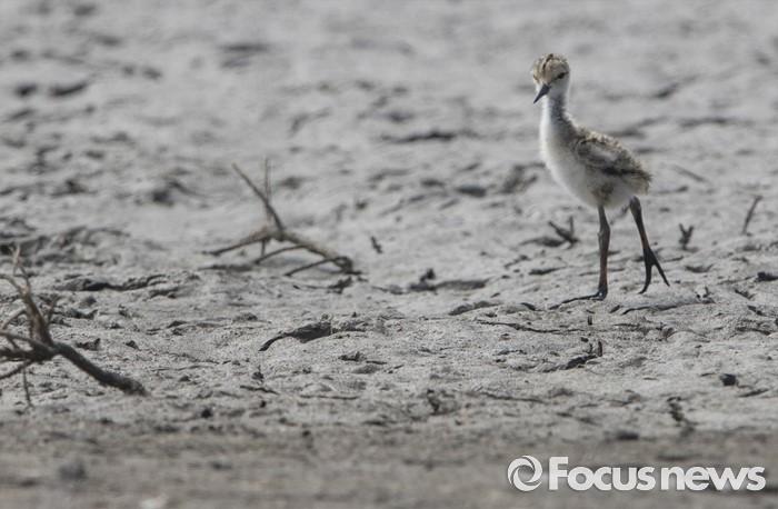 (인천=포커스뉴스)부화한 지 약 1 주일 정도로 영종도 매립지 습지에서 가장 늦게 세상에 나온장다리물떼새 어린새가 26일 오전 말라 가는습지에서 물을 찾고 있다.