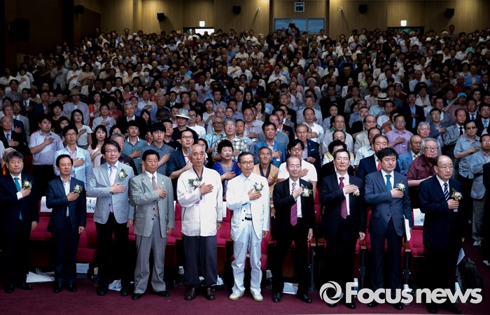 (서울=포커스뉴스) 26일 오후 서울 여의도 국회 의원회관에서 열린 미래로 가는 바른 역사 협의회 발대식 및 식민사학 규탄대회에 참석한 허성관 상임대표(전 행정자치부 장관), 이종찬 전 국정원장 등 내빈들이 국기에 대한 경례를 하고 있다.