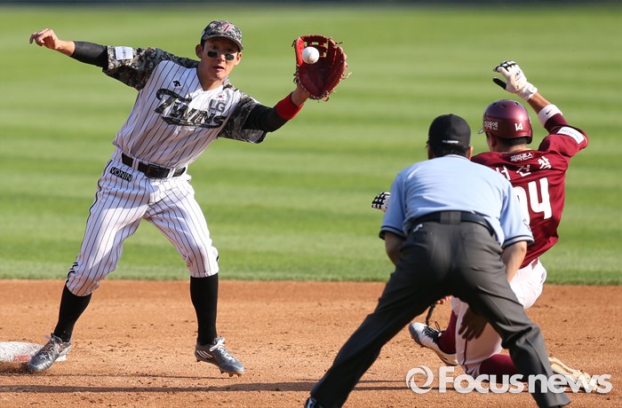 (서울=포커스뉴스) 26일 서울 잠실구장에서 열린 2016 프로야구 넥센-LG 경기 3회초 1사후 내야안타로 진루한 넥센 1루주자 서건창이 고종욱 타석때 2루 도루를 시도하고 있다.