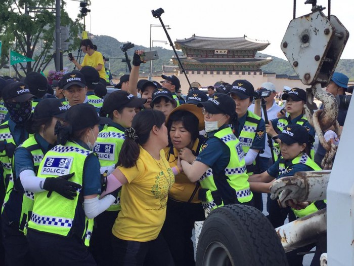 이 과정에서 폴리스라인을 발로 찬 유씨가 공용물건 손상 및 집시법 위반 등의 혐의로 경찰에 연행됐고 윤옥희씨도 경찰에 폭력을 휘두른 혐의(공무집행방해)로 함께 체포됐다.