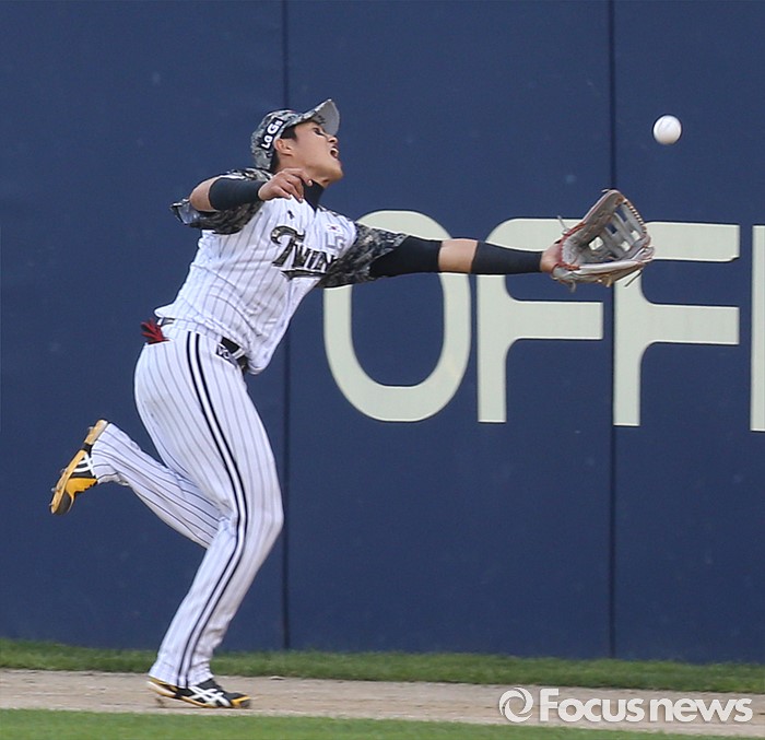 (서울=포커스뉴스) 26일 서울 잠실구장에서 열린 2016 프로야구 넥센-LG 경기 8회초 1사 1루에서 LG 우익수 채은성이 넥센 이택근의 타구를 잡으려 글러브를 뻗고 있다