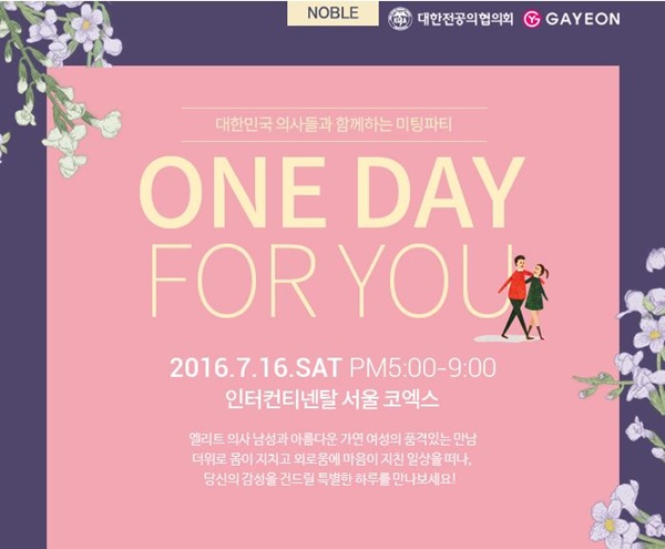 한편, 가연은 대한전공의협의회와 공식 제휴를 맺고, 전문적인 성혼 컨설팅과 매칭 서비스, 미팅파티 서비스를 제공하는 등 회원들의 성혼을 지원하고 있다.'원 데이 포 유' 미팅파티 개최를 알리는 포스터.<사진제공=가연>