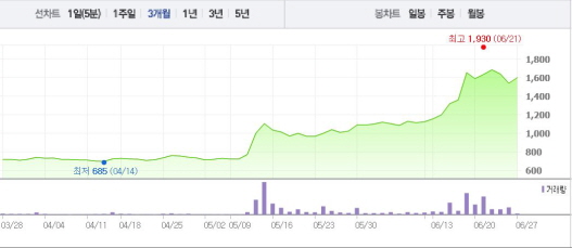 이어 키스톤글로벌은 “7월6일 임시주주총회가 개최될 예정”이라며 “전환사채 발행, 타법인 주식취득, 자산매각 등을 검토 중에 있지만 확정된 사항은 없다”고 덧붙였다.주가흐름<사진출처=네이버 캡쳐>