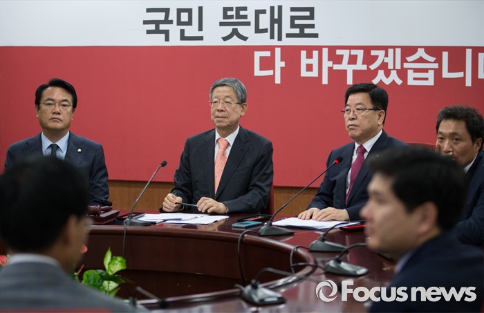 (서울=포커스뉴스) 김희옥(왼쪽 두번째) 새누리당 혁신비대위원장을 비롯한 혁신비대위원들이 27일 오전 서울 여의도 당사에서 열린 혁신비상대책위원회 회의에 참석하고 있다. 왼쪽부터 정진석 원내대표, 김 위원장, 김광림 정책위의장