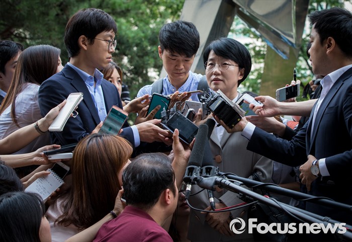 | △ 취재진 질문 답하는 박선숙 |