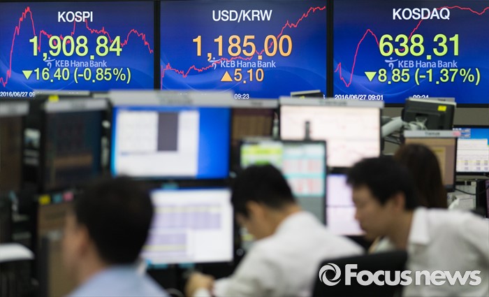 (서울=포커스뉴스) 브렉시트(영국 EU 탈퇴) 충격이 지속되고 있는 27일 오전 서울 중구 명동 KEB 하나은행 딜링룸에서 딜러들이 업무를 보고 있다.코스피는 전 거래일보다 23.39(1.21%) 포인트 하락한 1901.85로, 코스닥은 전 거래일보다 17.95(2.77%) 포인트 하락한 629.21에 시작했다. 원달러 환율은 5.6원 내린 1,174.3원으로 개장했다.