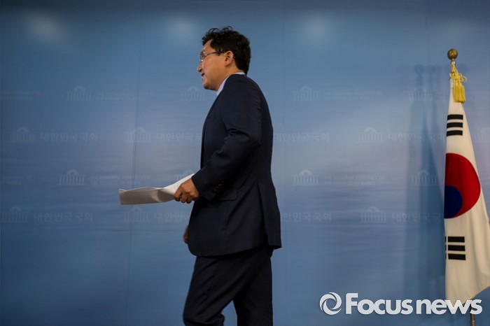 (서울=포커스뉴스) 김용태 새누리당 의원이 27일 오전 서울 여의도 국회에서 오는 8월 9일에 열리는 차기 전당대회 당 대표 경선 출마를 선언을 마친 뒤 기자회견장을 나서고 있다.