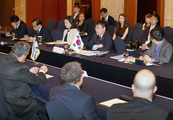 (서울=포커스뉴스) 여한구 산업통상자원부 FTA정책관(수석대표)이 27일 서울 중구 소공동 롯데호텔 에메랄드홀에서 네타 바엘(Netta Bar-El) 이스라엘 경제산업부 양자무역협정장(수석대표)을 비롯한 한-이스라엘 양국 정부대표단 50여명이 참석한 가운데 한-이스라엘 FTA(자유무역협정) 제1차 협상에서 인사말을 하고 있다. <사진제공=산업통상자원부>