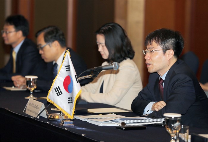 (서울=포커스뉴스) 여한구 산업통상자원부 FTA정책관(수석대표)이 27일 서울 중구 소공동 롯데호텔 에메랄드홀에서 네타 바엘(Netta Bar-El) 이스라엘 경제산업부 양자무역협정장(수석대표)을 비롯한 한-이스라엘 양국 정부대표단 50여명이 참석한 가운데 한-이스라엘 FTA(자유무역협정) 제1차 협상에서 인사말을 하고 있다. <사진제공=산업통상자원부>