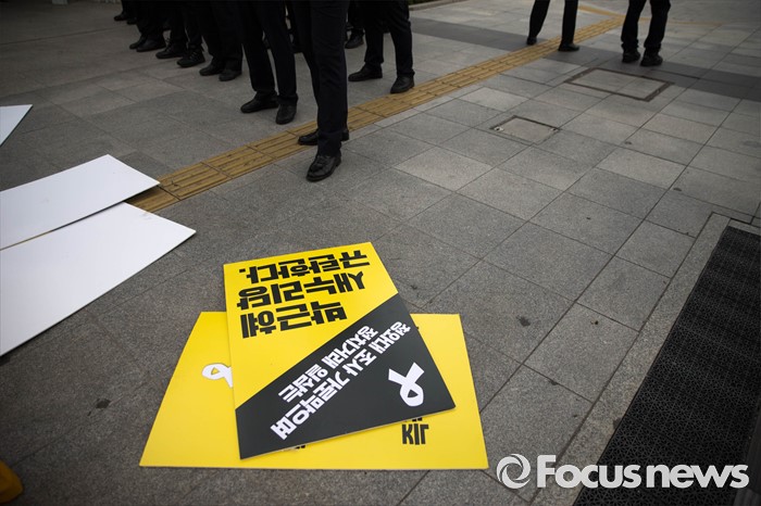 (서울=포커스뉴스) 27일 오후 서울 종로구 정부서울청사 앞에 박근혜 정부를 규탄하는 내용의 손피켓들이 땅에 놓여져 있다.