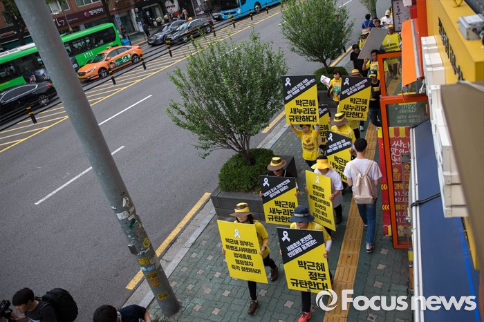 (서울=포커스뉴스) 27일 오후 서울 종로구 정부서울청사 앞에 세월호 관계자들이 세월호 특별법 개정 및 선체 인양을 촉구하는 기자회견을 하기 위해 청운동주민센터 앞으로 이동하고 있다.