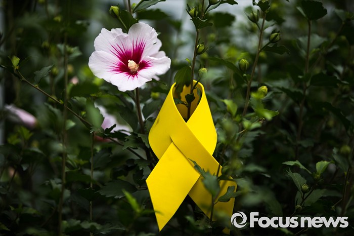 (서울=포커스뉴스) 27일 오후 서울 종로구 정부서울청사 앞 무궁화 꽃 옆에 세월호 희생자를 추모하는 노란 리본이 걸려 있다.