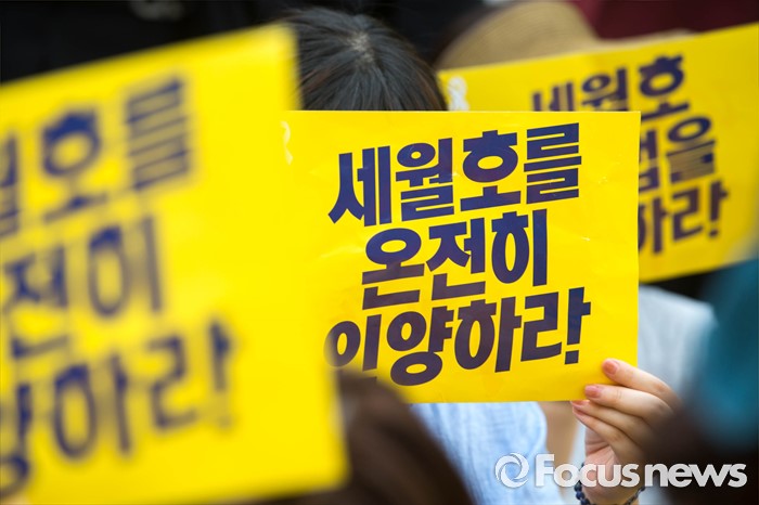 (서울=포커스뉴스) 27일 오후 서울 종로구 청운효자동주민센터 앞에서 416 가족협의회와 416 연대 관계자들이 세월호 특조위 강제해산과 박근혜 정부를 규탄하는 기자회견을 하고 있다.