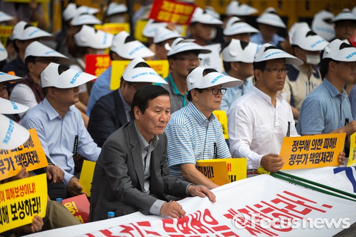 (서울=포커스뉴스) 28일 오전 서울 종로구 정부서울청사 앞에서 개성공단 입주기업 비대위 관계자들이 방북 승인을 촉구하는 집회를 하고 있다.