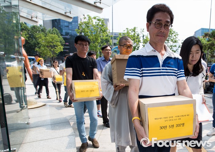 (서울=포커스뉴스) 28일 오전 서울행정법원 앞에서 세월호 희생 기간제교사 순직인정촉구대책위 회원들이 순직 인정 촉구 소송 기자회견을 마친 후 소장과 순직 인정 요구 서명지 상자를 법원에 전달하고 있다.