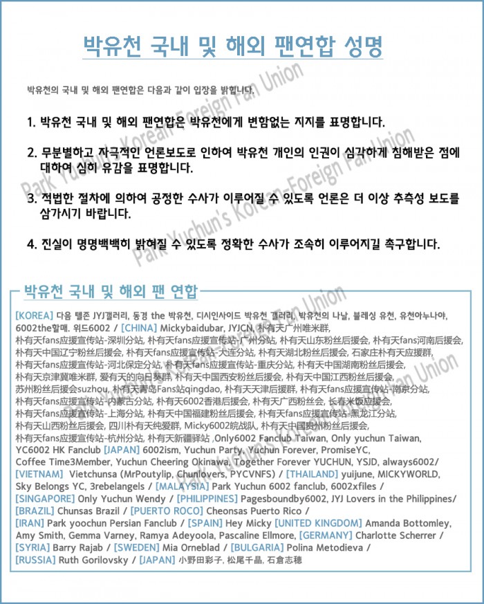 성명서는 한국을 포함해 일본·베트남·태국·스페인·영국·러시아 등 19개국의 박유천 팬들이 공동으로 낸 것으로 한국어·영어·일본어·중국어의 네 가지 언어로 발표됐다.