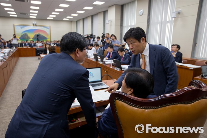 (서울=포커스뉴스) 이진복(가운데) 국회 정무위원회 위원장과 전해철(왼쪽) 더불어민주당 간사, 유의동 새누리당 간사가 28일 오전 서울 여의도 국회에서 열린 정무위원회에 참석해 의견을 나누고 있다.