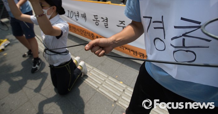 (서울=포커스뉴스) 28일 오전 서울 마포구 한국경영자총연합회 회관 앞에서 알바노조 조합원들이 10년 연속 최저임금 동결을 주장하는 경총 규탄 퍼포먼스를 펼치고 있다.