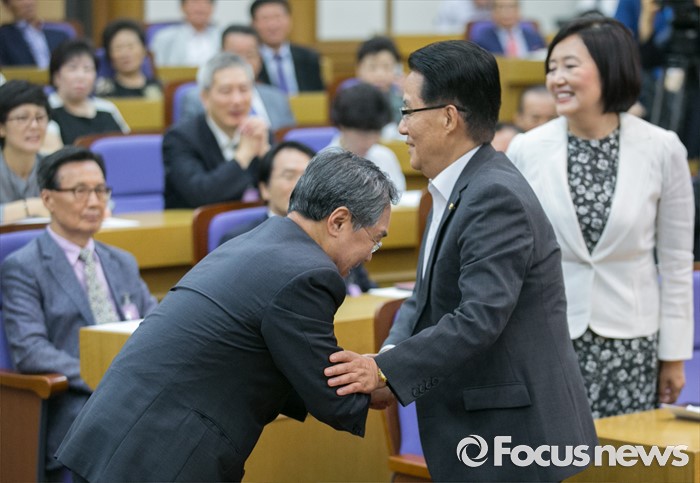 (서울=포커스뉴스) 28일 오전 서울 여의도 국회 의원회관에서 열린 '한국적 제3의 길' 창립 기념 초청 강연, '한국경제와 20대 국회가 가야할 길'에 참석한 우윤근(왼쪽) 국회 사무총장과 박지원(가운데) 국민의당 원내대표가 악수하고 있다. 오른쪽은 박영선 더불어민주당 의원.