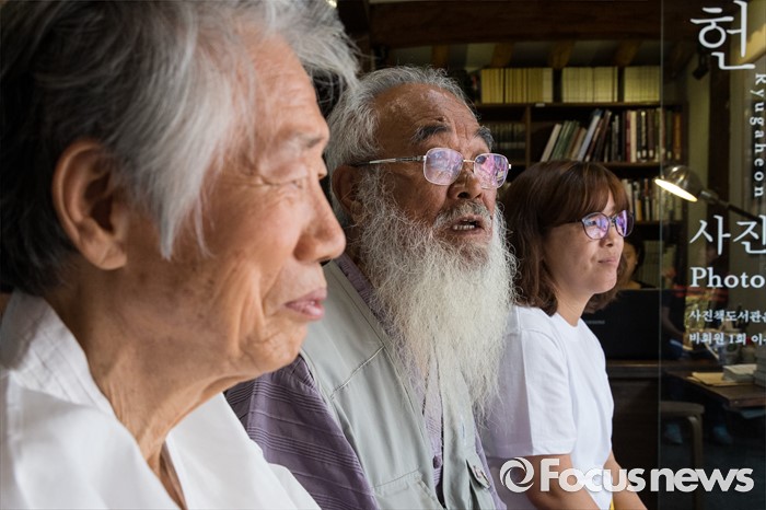 (서울=포커스뉴스) 28일 오전 서울 종로구 류가헌 갤러리에서 백기완(왼쪽) 통일문제연구소 소장과 문정현(가운데) 신부, 유흥희 꿀잠 집행위원이 '시대의 2인전 두 어른' 기자간담회에 참석해 취재진의 질문에 답하고 있다.