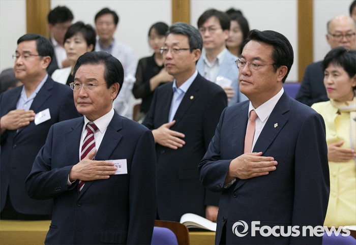(서울=포커스뉴스) 28일 오후 서울 여의도 국회 의원회관에서 열린 4차 산업혁명포럼 창립총회에 참석한 정진석(오른쪽부터) 새누리당 원내대표, 김성식 국민의당 정책위의장, 변재일 더불어민주당 정책위의장 등 의원 및 참석자들이 국기에 대한 경례를 하고 있다. 이날 창립한 포럼은 여야 3당 비례대표 1번인 송희경 새누리당 의원, 박경미 더불어민주당 의원, 신용현 국민의당 의원을 주축으로 구성된 포럼이다.