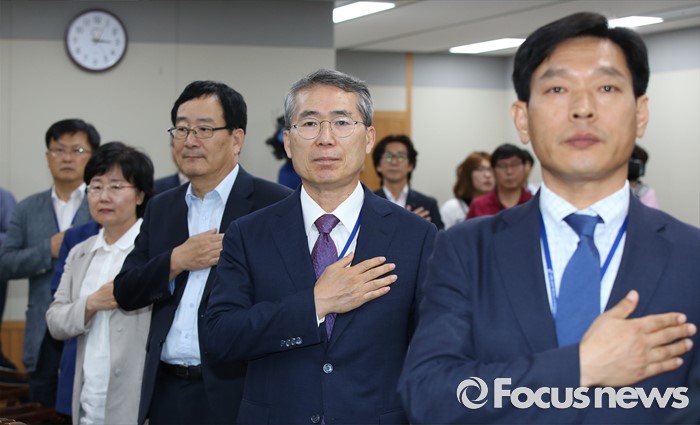 (세종=포커스뉴스) 박준성(오른쪽 두 번째) 최저임금위원회 위원장이 28일 오후 세종시 정부세종청사 고용노동부 최저임금위원회 전원히의실에서 열린 최저임금위원회 제7차 전원회의에서 국기에 대한 경례를 하고 있다.