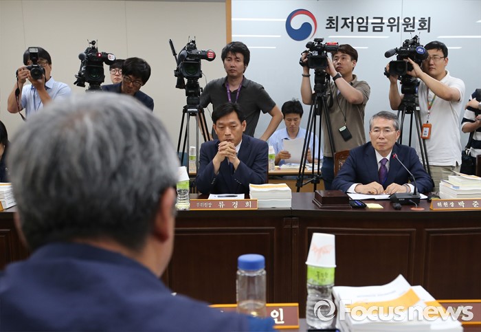 (세종=포커스뉴스) 박준성 최저임금위원회 위원장이 28일 오후 세종시 정부세종청사 고용노동부 최저임금위원회 전원히의실에서 열린 최저임금위원회 제7차 전원회의에서 김종인 노동계 위원의 발연을 듣고 있다.