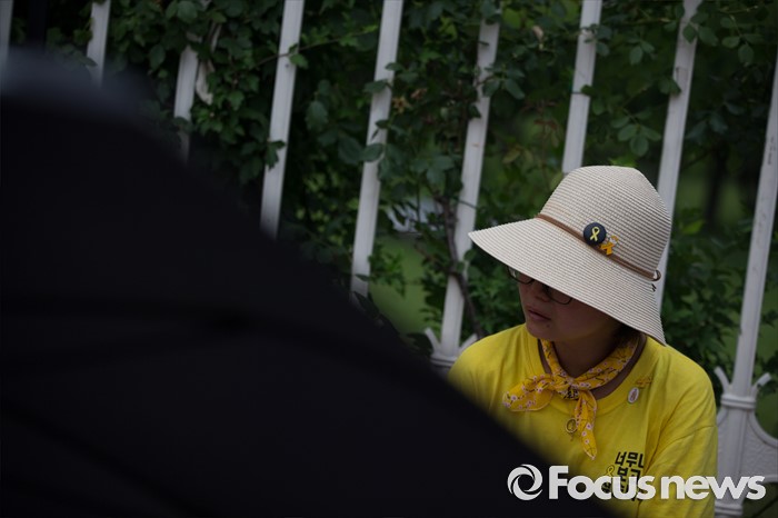 (서울=포커스뉴스) 416가족협의회와 4월16의약속국민연대가 28일 오후 서울 여의도 국회 앞에서 '20대 국회 6월 임시국회에 특별법 개정 촉구' 기자회견을 가졌다. 한 관계자가 국회 정문 앞에서 힘 없이 앉아 있다.