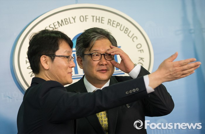 (서울=포커스뉴스) 김영수 신임 국회 대변인(오른쪽)과 권혁기 국회 부대변인이 28일 오후 서울 여의도 국회 정론관에서 취임 인사 브리핑을 하고 있다.