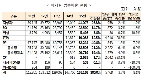 방송광고매출은 2011년 이후 점차 감소 추세였으나, IPTV, 종합편성PP, CJ계열PP 등의 광고매출 증가로 인해 전년대비 1690억원(5.1%) 증가한 3조4736억원이며, 전체 방송광고시장에서 지상파의 비중은 감소(2006년 75.8%→2015년 55.0%)하고 있으나 PP의 비중은 증가(2006년 21.1%→2015년 38.9%)하는 추세로 나타났다.