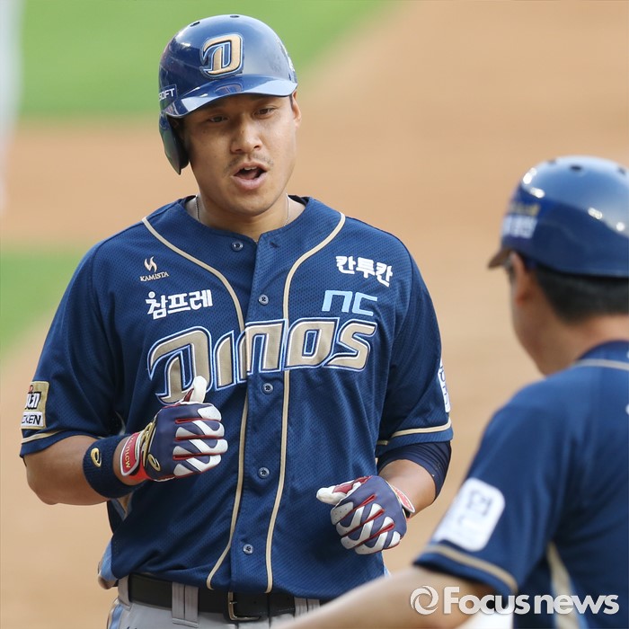 (서울=포커스뉴스) 28일 서울 잠실구장에서 열린 2016 프로야구 NC-두산 경기 2회초 NC 선두타자 조영훈이 두산 투수 니퍼트의 초구를 떄려 우월 솔로 홈런을 치고 전준호 코치의 환영을 받으며 홈인하고 있다.